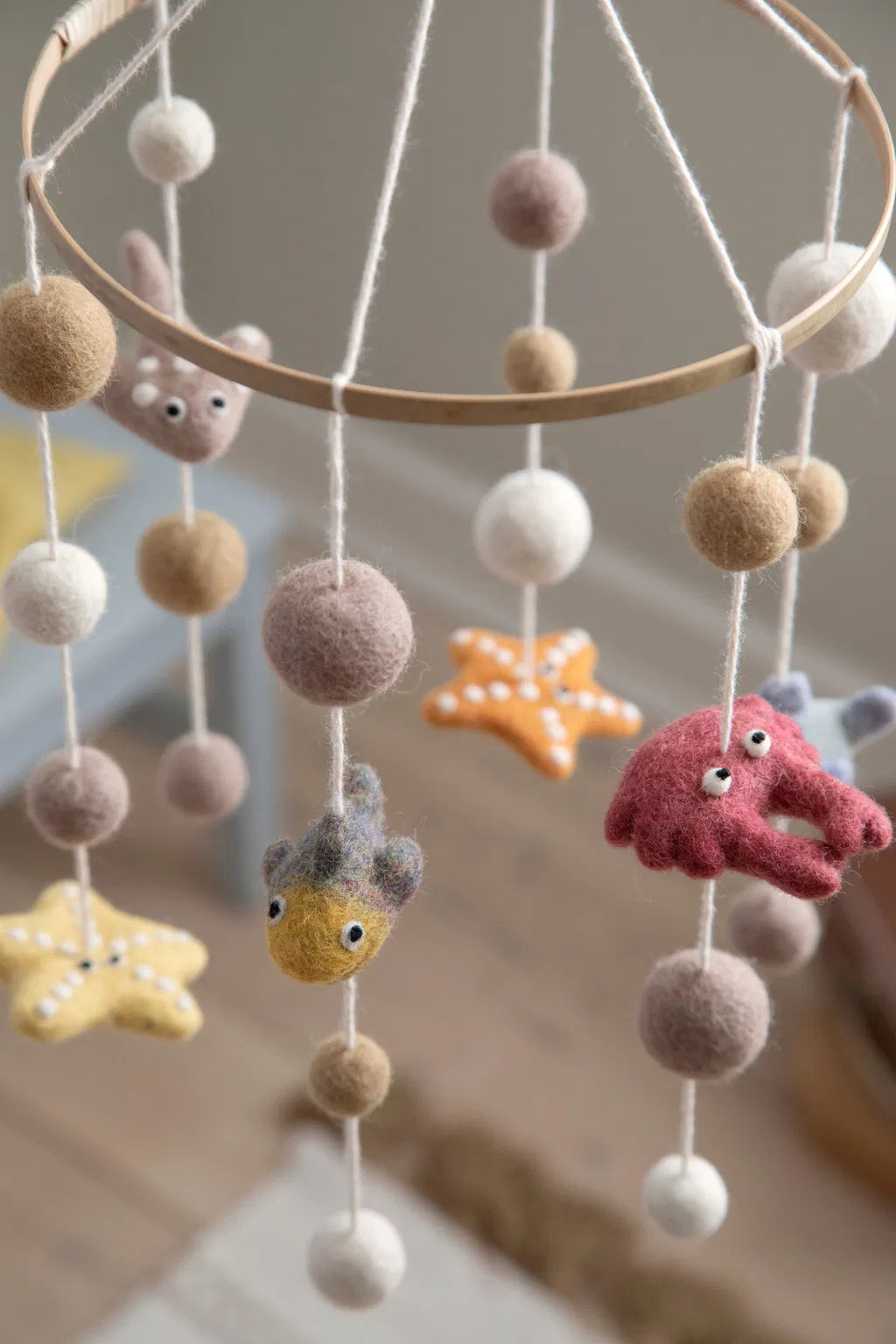 Ar burvīgu roku filcētu jūras dzīvnieku klāstu — zivis, jūras zvaigzne, krabis un citi —, kas karājas no riņķa pie kokvilnas cilpas, šis karuselis aizrauj un stimulē jūsu mazulīša attīstošās maņas. Izstrādāts Dānijā un ar mīlestību Nepālā pieredzējušu amatnieku rokām izgatavots, ievērojot godīgas tirdzniecības nosacījumus, tas ir priekšmets, ko gan vecāki, gan mazie vērtē vienlīdzīgi.