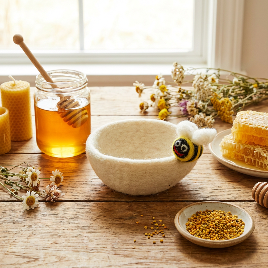 Zejdź na koniec ogrodu, a z pewnością znajdziesz te drobne stworzonka czyhające! Każda z tych wspaniałych miseczek na drobiazgi filcowanych na mokro jest ozdobiona własnym pięknym zwierzątkiem filcowanym igłowo (te stworzonka wcale nie są straszne!) i została wykonana ręcznie z materiałów zrównoważonych i biodegradowalnych. Dostępne w wyborze trzech różnych stylów - trzmiel, motyl lub biedronka.