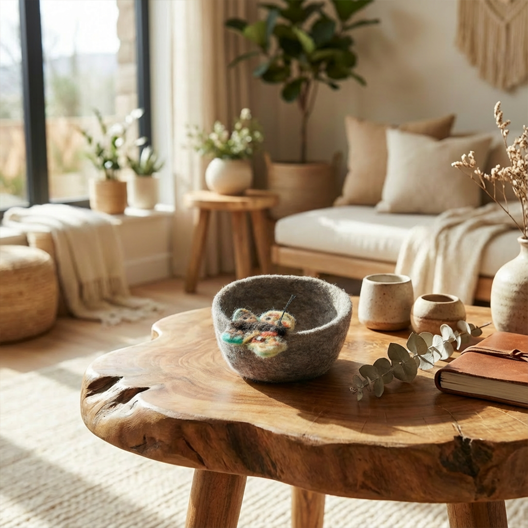 Ręcznie wykonany filcowy talerzyk na drobiazgi z ogrodowymi robaczkami — dekoracja do domu